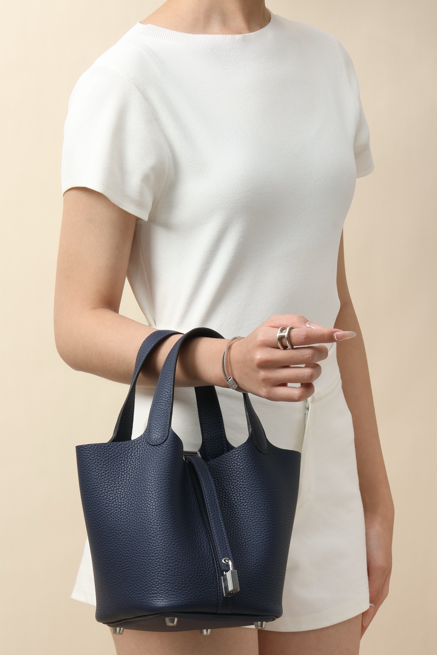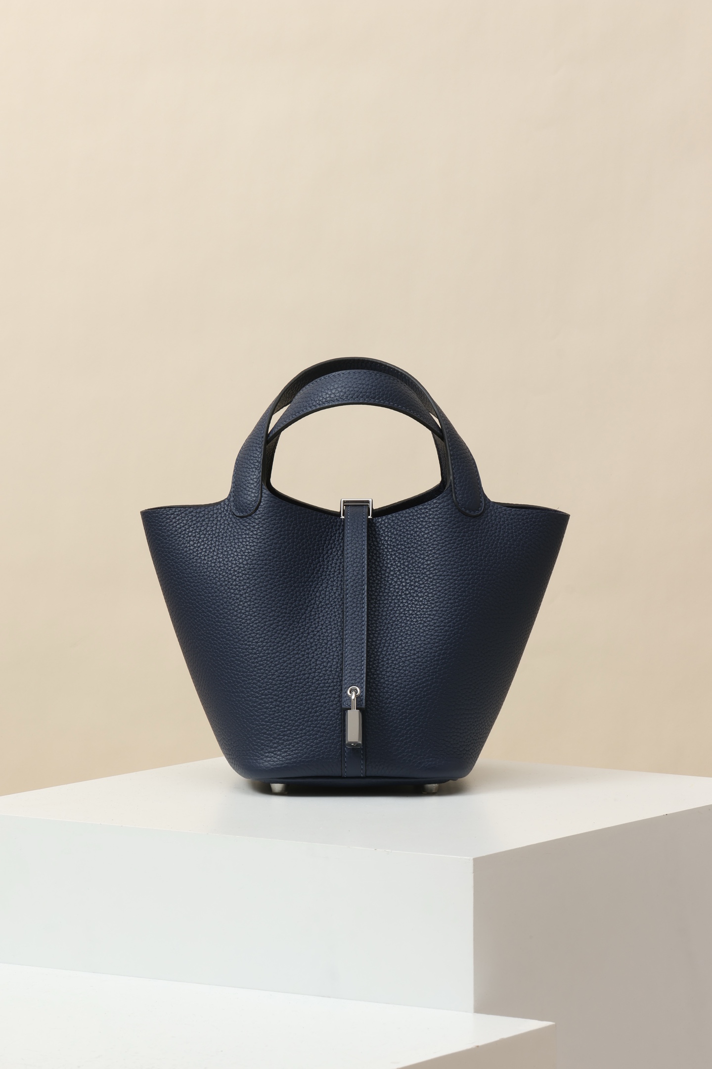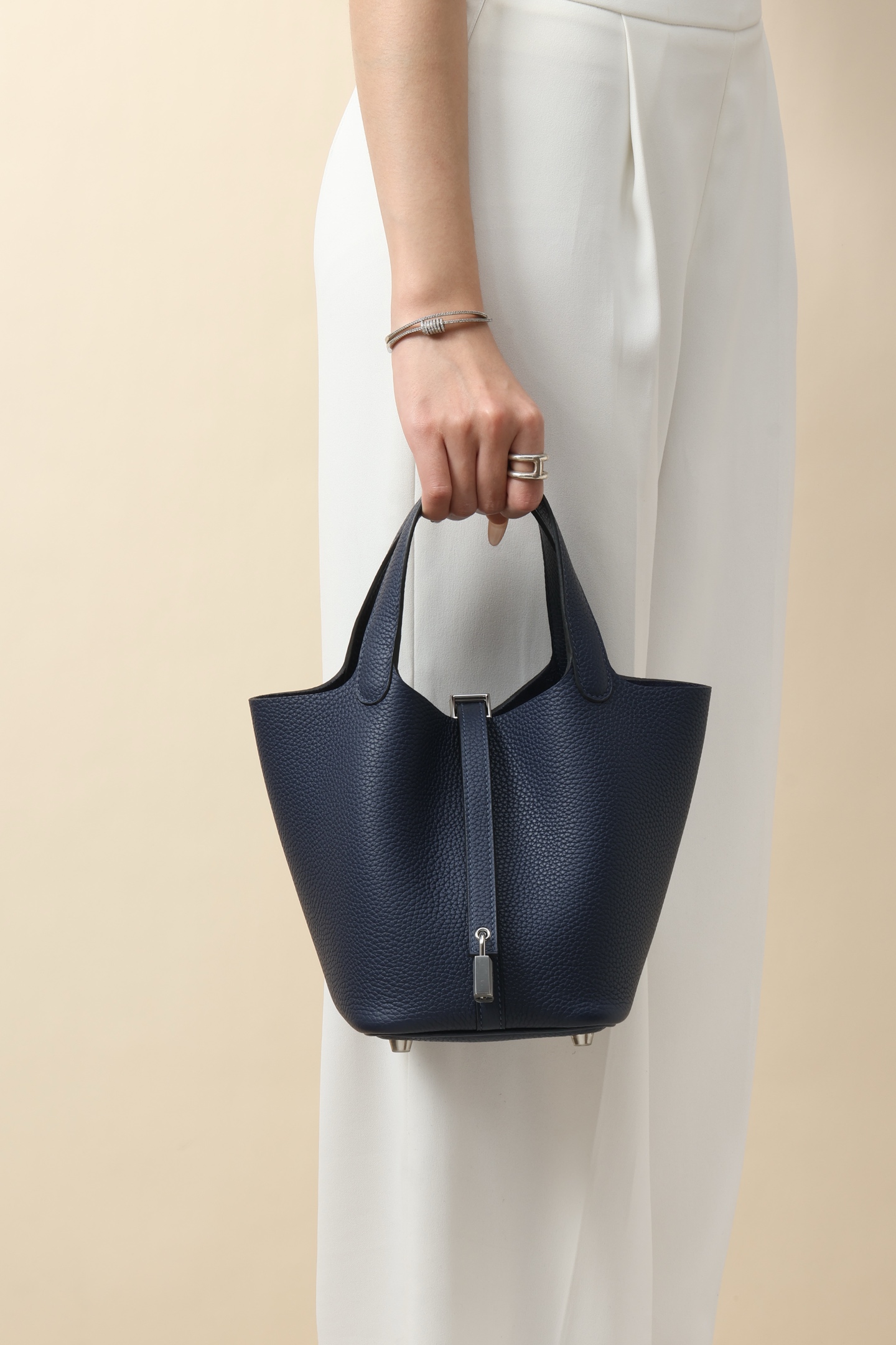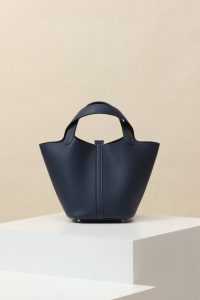 Size: 18cm in length, 13cm in depth, and 18cm in width. The TC large cowhide water bucket bag has added a strap at the opening and is equipped with an “H” special lock, which can be carried by hand and is lightweight