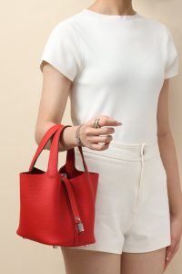 The TC leather bucket bag has added a strap at the opening and is equipped with an “H” special lock that can be carried by hand and is lightweight