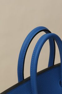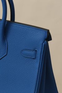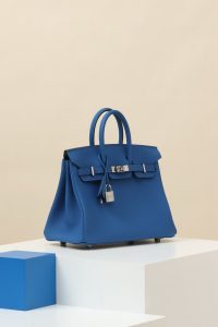 Model: BK25 Color: 71 French Blue Dimensions: 25 cm (length) x 20 cm (depth) x 13 cm (width) Togo Leather Handbag Features an interior zip pocket Comes with a leather – wrapped lock Can be carried either by hand or slung over the shoulder Manufactured in France. Metallic finish: Gold